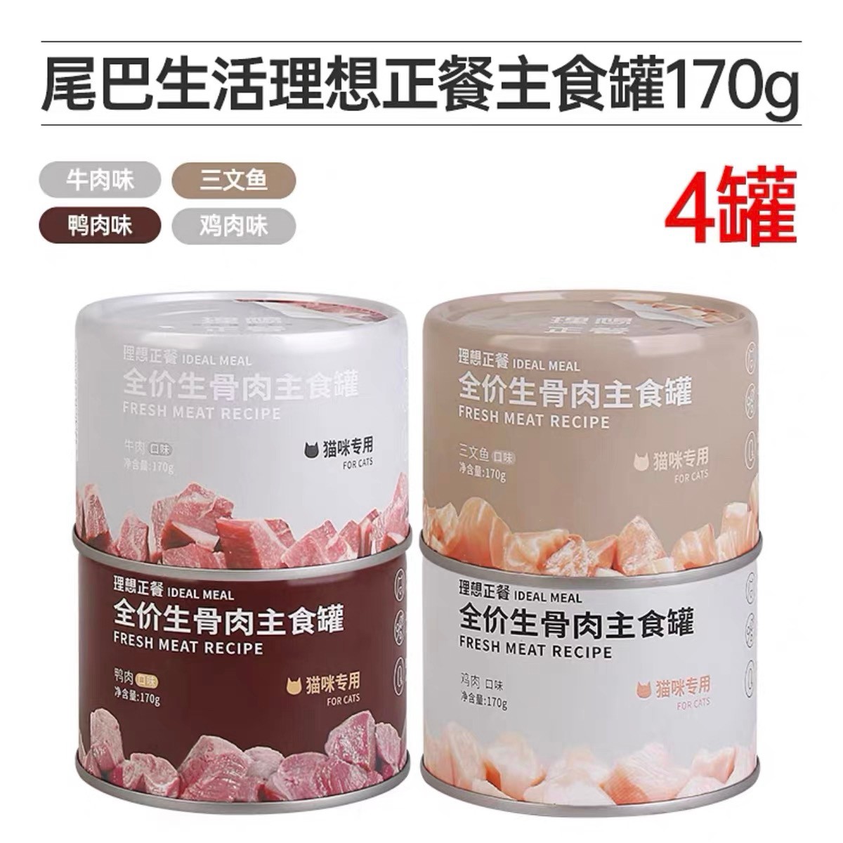 尾巴生活 猫咪生骨肉主食罐头 营养理想正餐4罐混合装 170g一罐✖️4