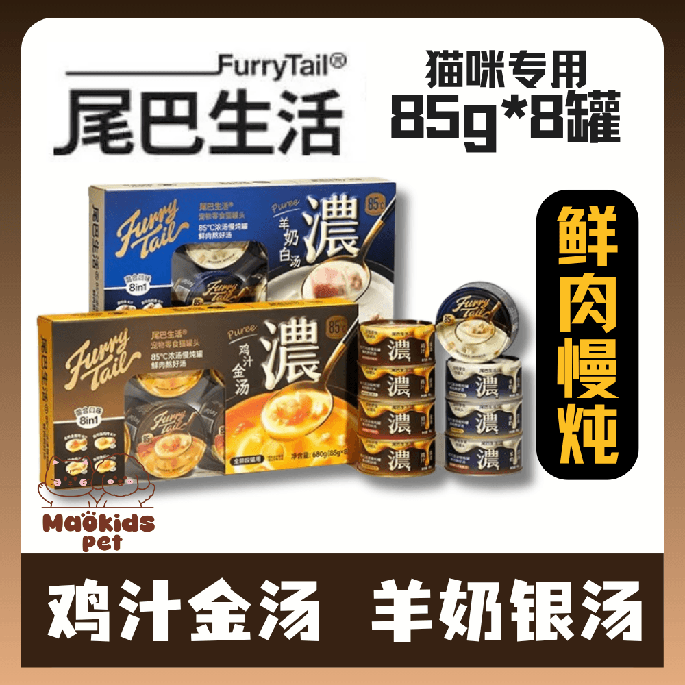尾巴生活 85度浓汤慢炖罐羊奶银汤鸡汁金汤罐头 猫咪专用 两口味可选 一盒85g*8罐入