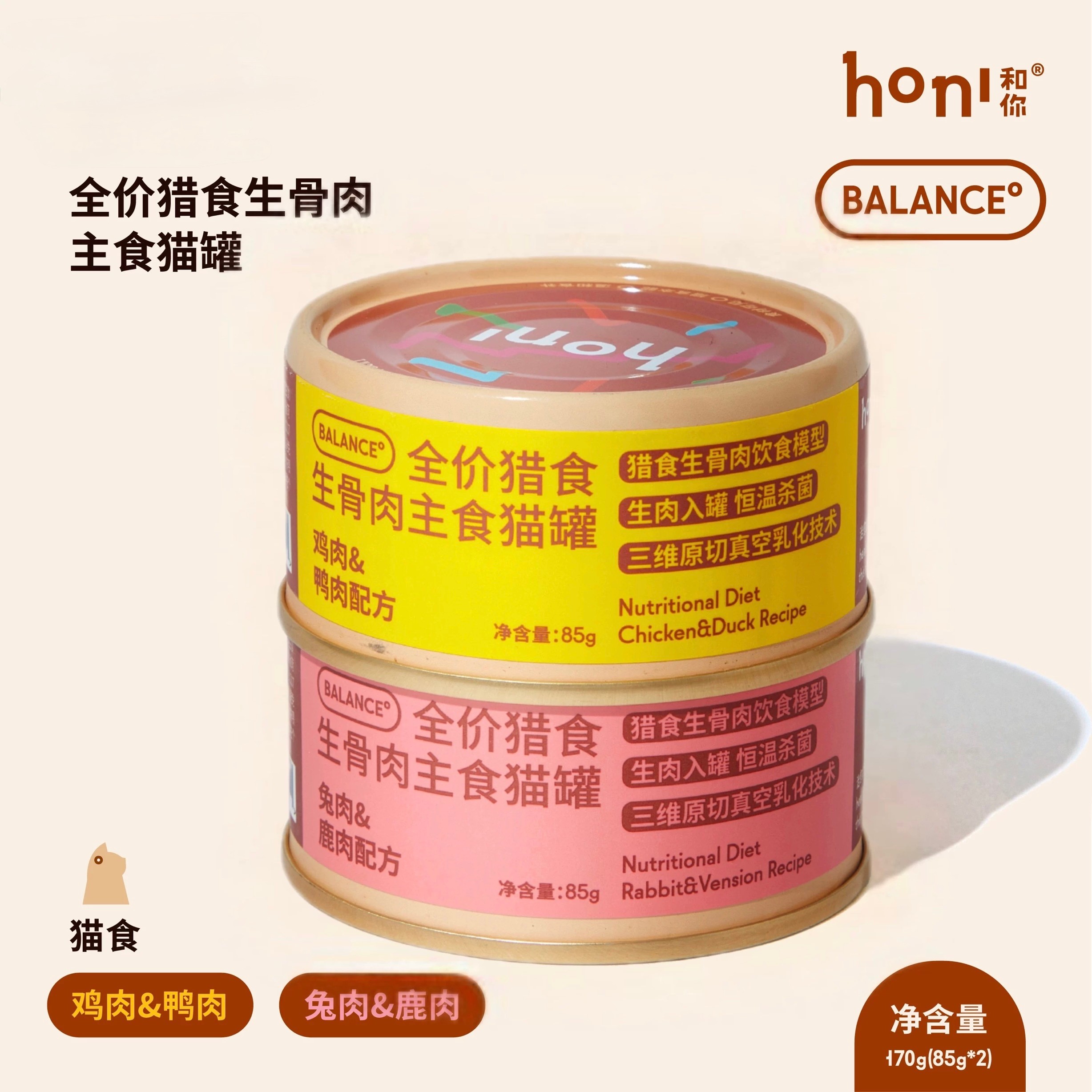 honi和你® 全价猎食生骨肉主食猫罐头 营养湿粮 鸡鸭兔鹿肉多款可选 一套85g*4罐