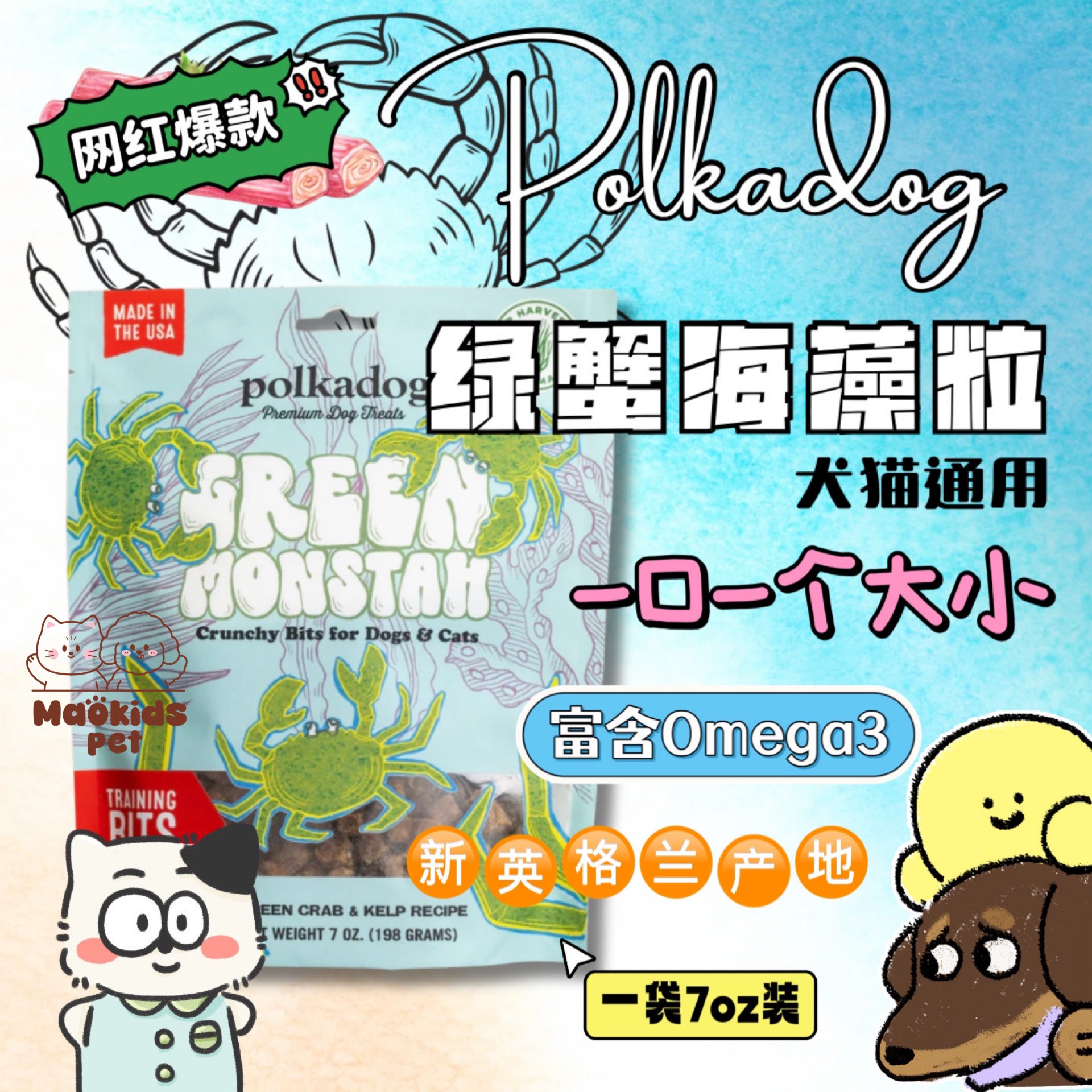 Polkadog 绿蟹海藻营养零食 富含Omega3优质蛋白质 美毛亮肤 犬猫通用 一袋7oz
