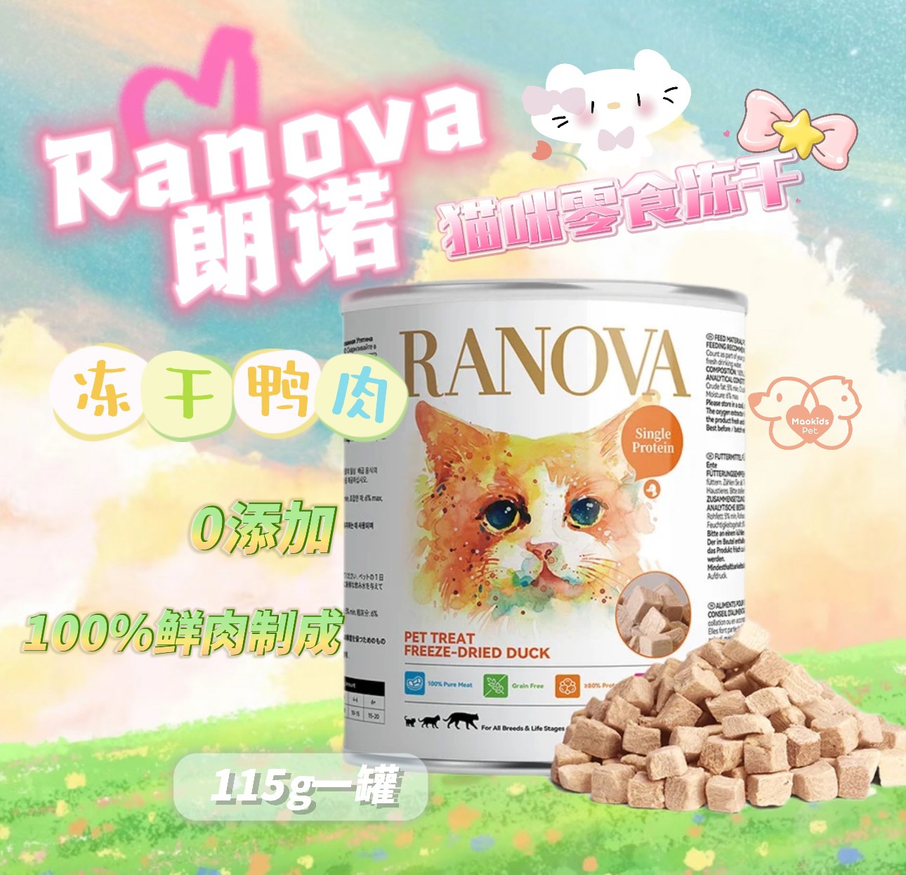 Ranova朗诺 冻干鸭肉粒 100%纯肉配方 宠物零食冻干 一罐115g