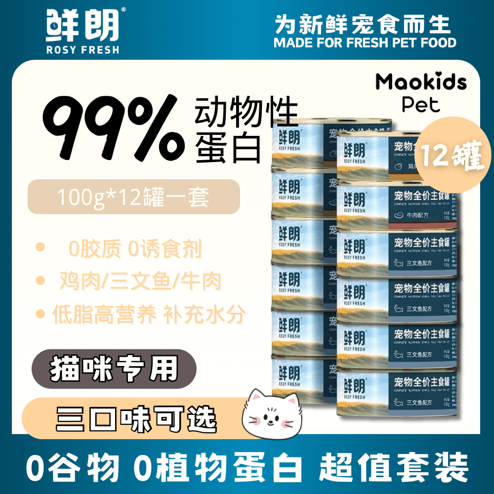 Rosy Fresh鲜朗 全价猫主食肉酱罐头 99%动物性原料 鸡肉/三文鱼/牛肉三口味可选 一盒100g*12罐